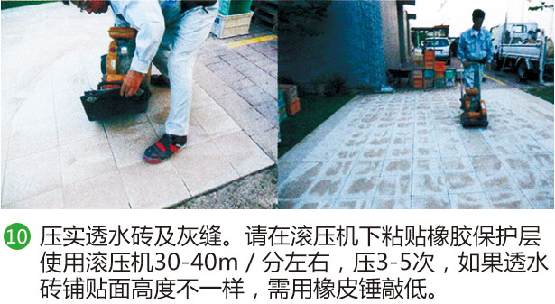 10、壓實透水磚及灰縫。請在滾壓機下粘貼像膠保護層,使用滾壓機30-40m/分左右,壓3-5次,如鋪貼面高度不一,需用橡皮錘敲平