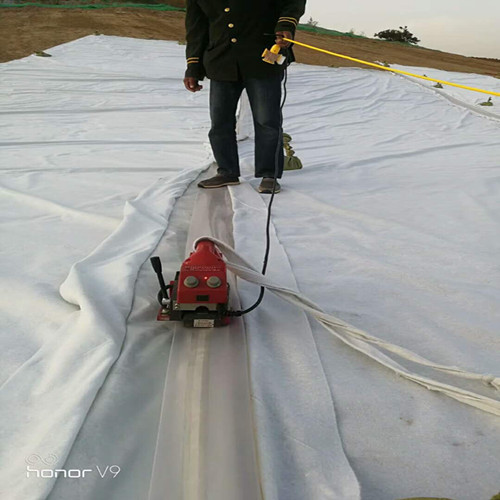 土工膜或復(fù)合土工膜的焊接、粘結(jié)、槽中拼接、周邊錨著、頂部連接及鋪設(shè)工藝,土工膜的接拼應(yīng)盡量避免拾遺補(bǔ)缺,尤其是焊接工藝,應(yīng)盡量減少漏焊、虛焊及一條焊縫有多次停頓;土工膜在槽中搭接時(shí),兩幅膜應(yīng)盡量貼緊;對于水頭高、膜較厚,或可能發(fā)生較大位移的情況,膜與基巖或混凝土連接時(shí),應(yīng)盡可能要用螺栓連接,并留有變形余幅;必須高度重視土膜施工質(zhì)量標(biāo)準(zhǔn);施工人員必須能夠根據(jù)施工條件處置各種復(fù)雜情況。土工膜邊坡穩(wěn)定分析采用極限平衡法。斜坡上的土工膜選用加糙的土工膜。土工膜下支持層采用弱透水性材料。土工膜施工時(shí)清場、鋪設(shè)、熱熔焊接、膜保護(hù)的措施要完善。
