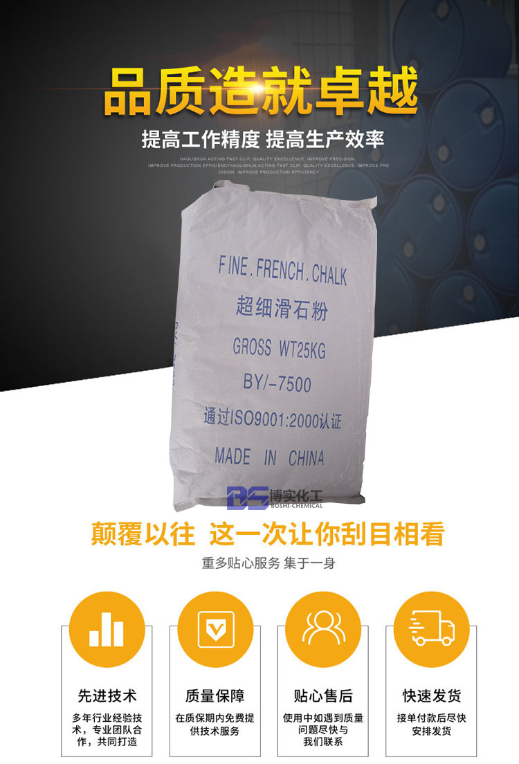 滑石粉 用于橡膠、塑料、油漆、等化工行業作為強化改質填充劑 ,增加產品形狀的穩定,增加張力強度,剪切強度,繞曲強度,壓力強度,降低變形,伸張率,熱膨脹系數,白度高、粒度均勻分散性強等特點,還用于制造高頻瓷、無線電瓷、各種工業陶瓷、建筑陶瓷、日用陶瓷和陶釉等。