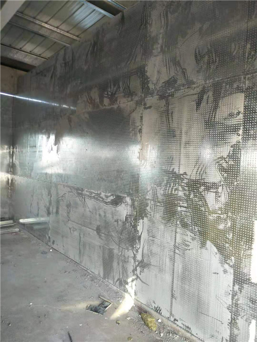 (2)纖維水泥復合鋼板(防爆板)是由上下兩塊沖孔的0.5m厚鍍鋅鋼板**壓擠在8.5m厚纖維水泥上構成的合成防火板材。 夾在兩層鋼板中間的纖維水泥層具有吸收**作用。