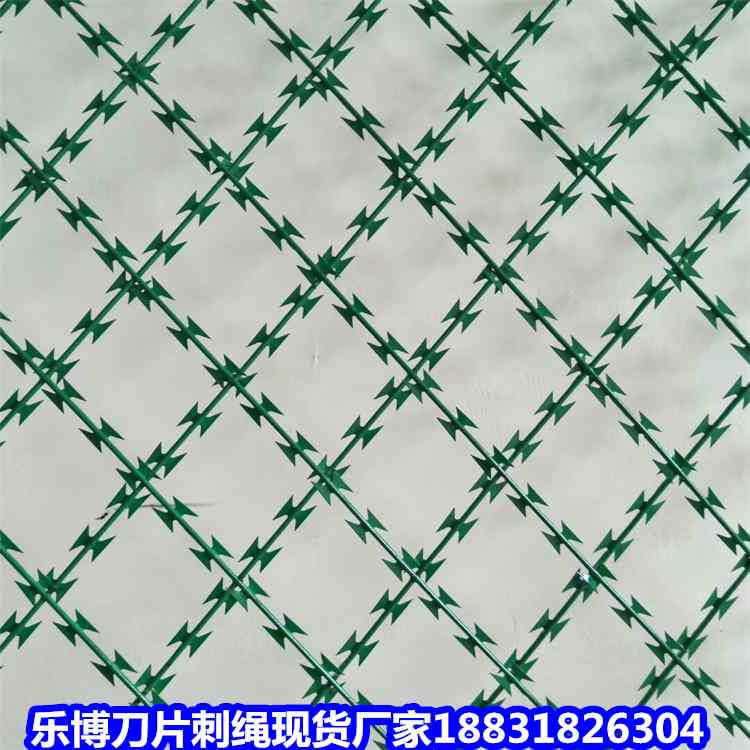螺旋型刀片刺繩是刀片刺繩成螺旋狀,是在兩條刀片刺網之間以不銹鋼片和鍍鋅鋼片強力夾扣,展開后即呈交叉狀,美觀又實用,卷經大小可供選擇,圈數也可供選擇,大小均可定做,具有防腐、防老化、抗曬、耐用等特點,防腐蝕,比一般鐵絲使用壽命更長,這種是日常生活中常見,也是應用廣的刺繩,