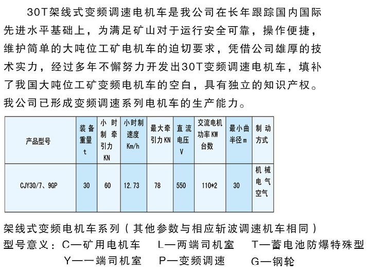 cjy30/9g(p)架線式電機車采用國際先進的vvvf交流變頻變壓調速技術,將架線的直流電通過大功率igbt元件逆變為頻率可調的三相交流電,驅動三相異步電動機作為機車動力,由于采用了vvvf控制技術,使三相異步電動機達到和超過直流電機的起動轉矩和牽引特性,使機車帶重載起動強勁有力。它與傳統的直流電機車比較,有交流電機不易損壞,司控器無觸頭無磨損,并能將制動時的機械能轉變為電能回饋。該機車技術先進、設計新穎、駕駛舒適、安 全可靠、節能降耗。