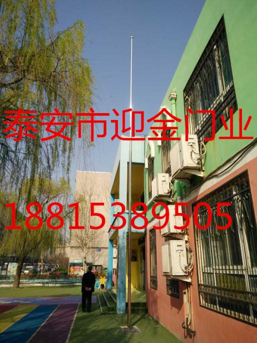 泰安 迎金幼兒園不銹鋼旗桿通過強勁的風泵和吹風裝置,使旗子在風小或無風的情況下同樣舒展飄蕩,莊嚴尊貴。這樣的裝置一般適用于室內無風或有特殊要求的地方。順風定位裝置通過特殊的裝置,旗幟無論在風向怎樣變動,旗子和旗繩都不會纏繞在旗桿上,始終隨風高高飄揚。而其他廠家非順風定位旗桿的旗子則容易隨風向的改變而纏在旗桿上,不僅旗子飄不起來,有損形象,而且降旗困難,造成人力物力多面不良影響。