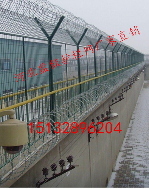 監獄防護網又稱監獄護欄網或監獄隔離柵,主要是采用高強度的刀片刺網與普通防護網的結合,由v型支架立拄,加強型焊接片網,安 全防盜連接件和刀片刺網組成.刀片刺網是一種新型防護網,由銳利尖角鍍鋅鋼板或不銹鋼薄板做刀片,鋼絲做芯線組合而成的防護器材。