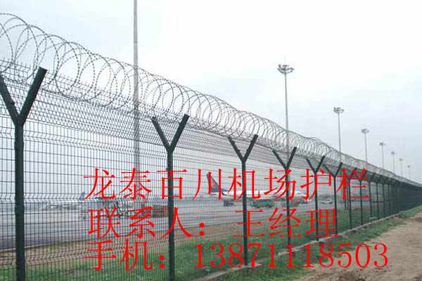 機場護欄網又稱機場隔離柵,機場防護網,機場鋼網墻機場防攀網,機場圍墻網等,主要是采用高強度的刀片刺網與普通防護網的結合,由v型支架立拄,加強型焊接片網,安 全防盜連接件和刀片刺網組成.刀片刺網是一種新型防護網,由銳利尖角鍍鋅鋼板或不銹鋼薄板做刀片,鋼絲做芯線組合而成的防護器材. 監獄防護網刀片刺網具有嚇阻、防翻越等效果,材質堅硬,高強度,高張力,造型設計獨特,不宜觸摸,因而能達到極好的防護隔離效果.機場護欄網還具有施工簡便,經濟實用等優點. 材質:機場防護網選用低碳鋼絲、鋁鎂合金絲 編織及特點:編制焊接而成。機場護欄網網格結構簡練、便于運輸、安 裝不受地形起伏限制,特別是對于山地、坡地、多彎地帶適應性極強。該產品堅固耐用、價格中等偏低,適合大面積采用。 機場護欄網規格: 1.立柱:50mm x 100mm x 3mm 表面為熱鍍鋅后浸塑。 2.鋼網邊框:35mm x 35mm x 3mm 表面為熱鍍鋅后浸塑。 3.鋼網: 20mm x 70mm x 4mm 表面為熱鍍鋅后靜電噴塑。 產品特點:機場防護網具有防腐、防老化、抗曬、耐候等特點。螺旋型交叉刀片刺網是在兩條刀片刺網之間以不銹鋼片和鍍鋅鋼片強力夾扣,展開后即呈交叉狀,美觀又實用。 監獄護欄網防腐形式:電鍍、熱鍍、噴塑、浸塑。 主要用途:機場圍墻加固 、私人高檔會所圍界網、軍事重地隔離網、 看守所外圍防護網、 開發區隔離網、戒毒所防爬網等使用.