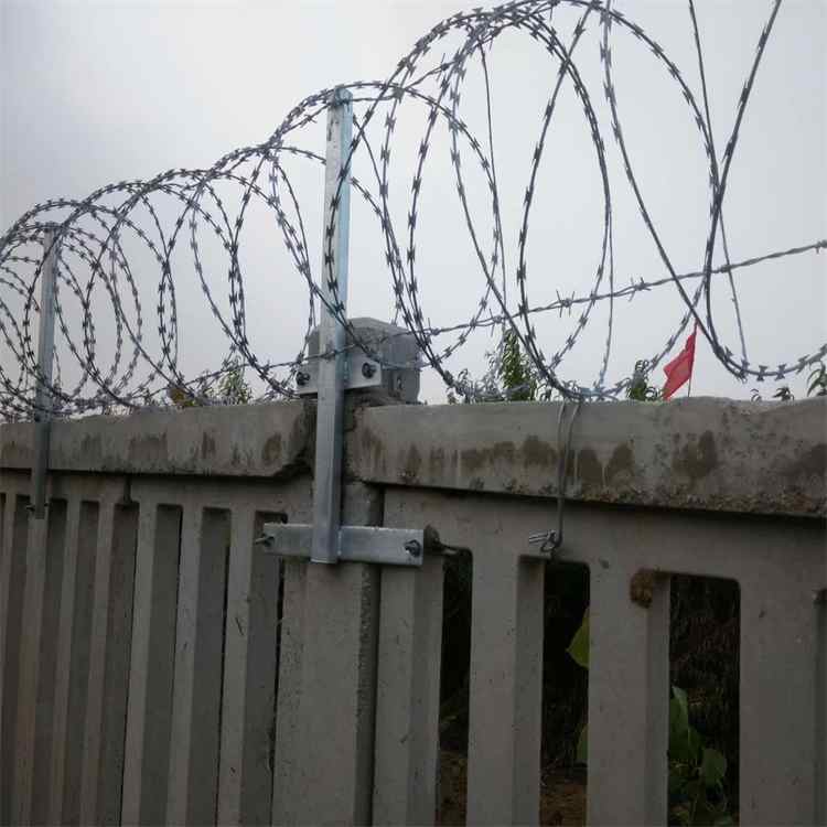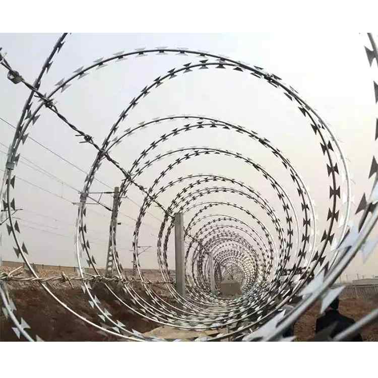 鐵路刺絲滾籠新建鐵路時速200公里以上,采用2.2米高度鋼筋混凝土防護柵欄+0.5米刺絲滾籠,設計時速200公里以下鐵路,一般地段采用1。8米高度鋼筋混凝土防護柵欄+0.5米刺絲滾籠,刺絲滾籠采用刀片刺繩繞圈后相鄰兩圈每隔120°用鐵絲連接卡固定,張開后形成蛇腹網狀,閉合后刀片刺繩圈徑為50cm,張開后每交叉圈安 裝間距20cm,直徑不小于45cm,刺絲滾籠下緣距離鋼筋混凝土防護柵欄上緣的垂直距離為0.05米。