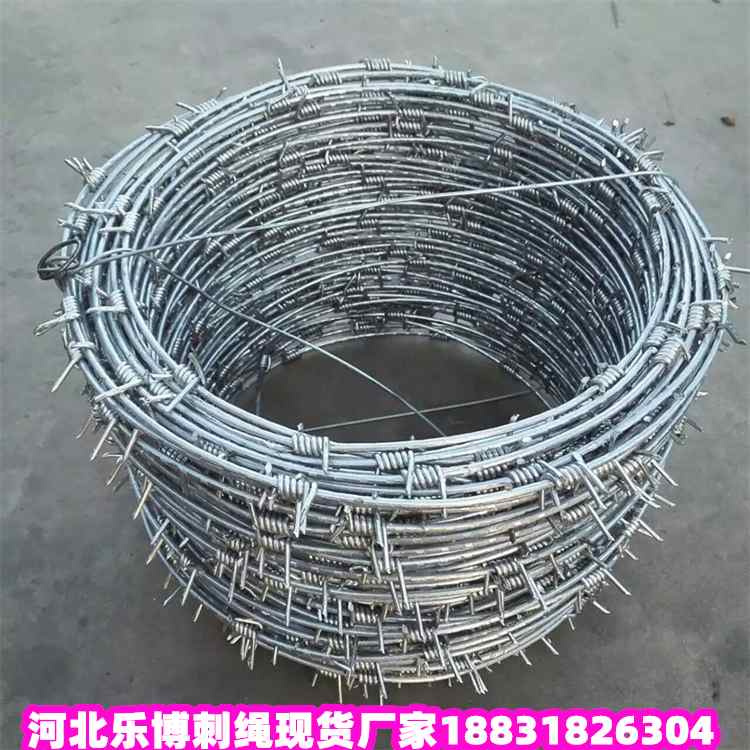 刺繩是由全自動化的刺繩機擰編而成。民間俗稱鐵蒺藜、刺絲、刺線。 成品種類: 單絲擰編和雙絲擰編。 原材料:優(yōu)質(zhì)的低碳鋼絲。表面處理工藝:電鍍鋅、熱鍍鋅、涂塑、噴塑。有藍、綠、黃等顏色。 用途: 用于草場邊界、鐵路、高速公路的隔離防護等。