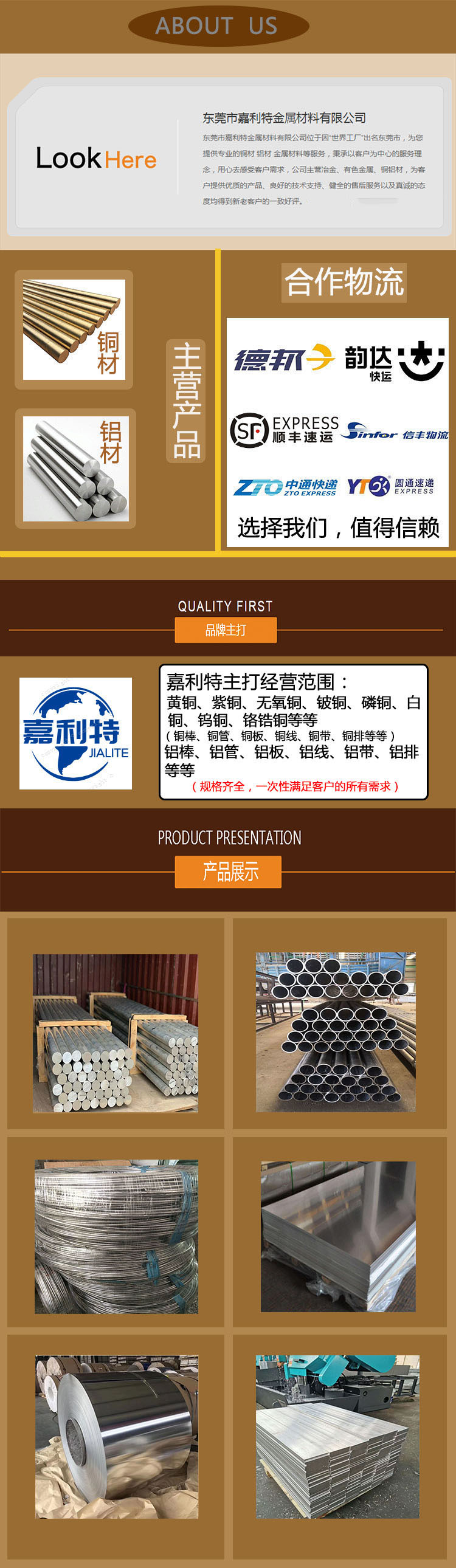 東莞市嘉利特金屬材料有限公司是一家集鋁及鋁合金生產經營于一體的綜合性企業,主要產品有鋁及鋁合金板、鋁卷、鋁帶、鋁箔、鋁棒、鋁管、鋁線、鋁排等產品都經過2003版iso9001質量體系認證。
