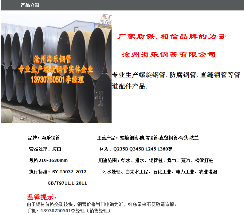 公司主要生產ф219-3600mm壁厚6mm-40mm的雙面埋弧焊螺旋管,填補了我國大口徑厚壁螺旋管,厚壁螺旋管及大 口徑螺旋管的空缺。公司擁有6條大型鋼管生產線,年產螺旋鋼管30萬噸,材質有q235b、q345b(16錳)、20#、l245、 l290,我們率先通過了iso9001-2000國際體系認證_,并一次性獲得國家質檢檢疫總局頒發的特種設備制造許可證_。先 進的生產設備,完備的檢測手段,高素 質的管理和技術人才, 目前我公司產品已覆蓋全國,產品質量和優質的服務 得到了顧客認可。公司在管理、生產、檢測、銷售服務過程中,靠科學管理,提高了質量, 靠質量增強了信譽,靠 信譽贏得了顧客,靠顧客發展了企業。