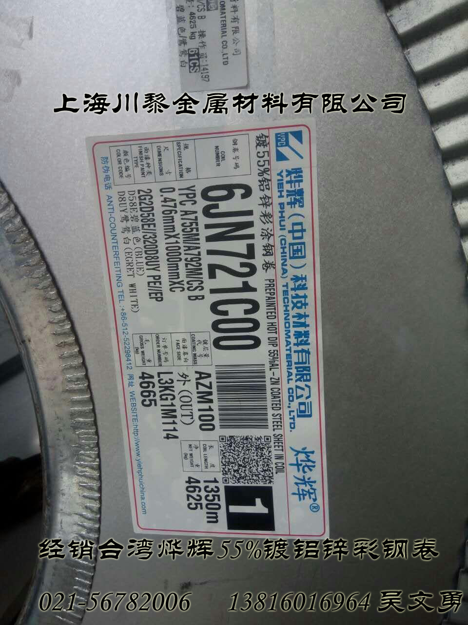 上海川黎金屬材料有限公司長期經銷代理燁輝生產的鍍鋁鋅鋼板,鍍鋁鋅耐指紋板,敷鋁鋅電器柜板,pvdf氟碳涂層彩鋼板,hdp高耐候彩涂卷,smp硅改性涂層鋼卷、