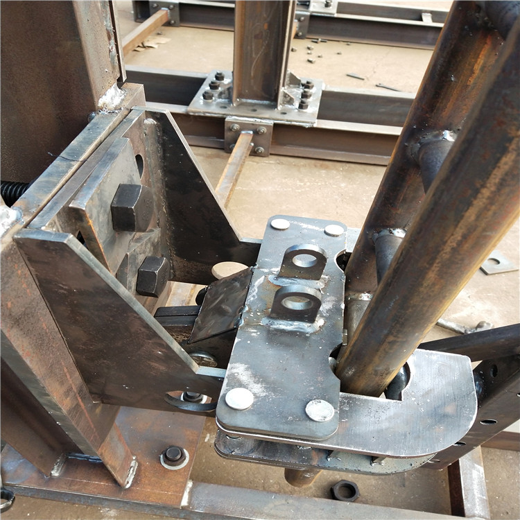 附墻導座是附墻機構通過穿墻螺栓固定安 裝在建筑物上;防墜機構能夠在模架體墜落時,進行制動,并將模架體所承受的重力通過附墻機構傳遞到建筑物上,也可以通過調節頂撐與模架體配合,固定支撐模架體;所述的防傾機構的防傾輪分別位于模架體的兩側,能夠防止模架體傾倒,在模架體移動時,具有導向和減小摩擦力的作用。因此,附墻支座具有固定支撐模架體、防止模架體墜落以及導向和減小摩擦力的積極效果。
