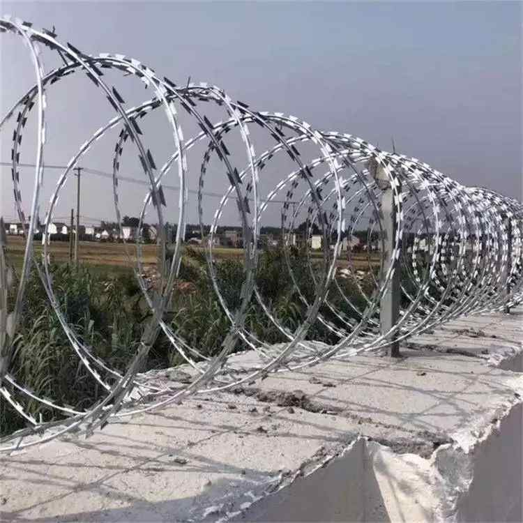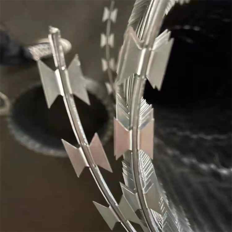 工 藝:它采用鋼板(刀板)沖壓成型包附于熱鍍鋅鋼絲(芯線)之上,由銳利尖角鍍鋅鋼板或不銹鋼薄板做刀片,高張力鋼絲做芯線組合而成的。