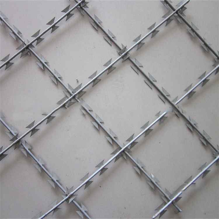 工藝:刀片刺網由熱鍍鋅鋼板或不銹鋼薄板沖壓出尖銳的刀片狀,高張力鍍鋅鋼絲或者不銹鋼絲做芯線組合而成的阻絕器材。由于刺網造形獨特不易觸摸,因而能達到極好的防護隔離效果。產品的主要材質有鍍鋅板和不銹鋼板。