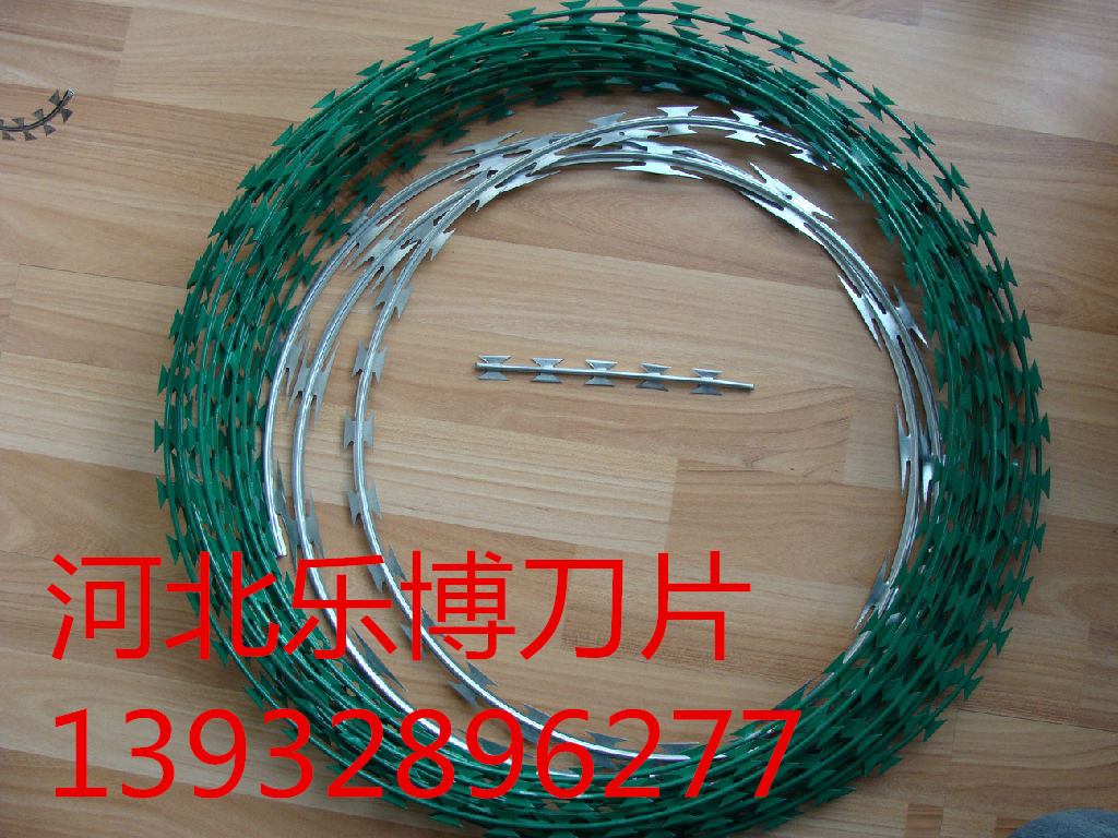 工藝:采用鋼板(刀板)沖壓成型包附于熱鍍鋅鋼絲(芯線)之上,由銳利尖角鍍鋅鋼板或 不銹鋼薄板做刀片,高張力鋼絲做芯線組合而成的。