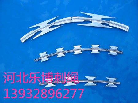 刀片刺繩防護網是一種新型防護網。該產品具有嚇阻效果好.美觀.施工便利.經濟實用等優異特點。刀片刺繩防護網主要用于園林公寓.機關單位.監獄.哨所.邊防等的圈禁防護。刀片刺繩防護網由銳利尖角鍍鋅鋼板或不銹鋼薄板做刀片,高張力鋼絲做芯線組合而成的阻絕器材。由于刀片刺繩防護網造形獨特不易觸摸,因而能達到極好的防護隔離效果。直線形刀片刺網由刀片型直線刺網交叉焊接成型,可用于防盜窗、高速護欄、隔離柵。施工迅速、效果顯著。刀片刺繩防護網,有多種架設方式可供選擇,施工迅速,既省經費,又可達到嚇阻的效果。