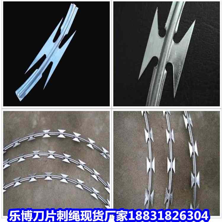 工 藝:它采用鋼板(刀板)沖壓成型包附于熱鍍鋅鋼絲(芯線)之上,由銳利尖角鍍鋅鋼板或不銹鋼薄板做刀片,高張力鋼絲做芯線組合而成的。