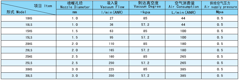 真空發生器性能表: