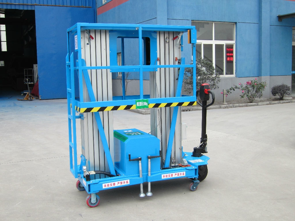 2. 雙立柱鋁合金高空作業平臺:計的新一代產品,整體采用高強度鋁型材精制而成由于型材強度高,使升降臺的偏轉與擺動極小。采用雙桅柱式結構,載重量大,平臺面積大,穩定性極好,運轉靈活,推行方便。它輕盈的外觀,能在極小的空間內發揮最高的舉升能力。該升降機廣泛用于廠房、賓館、大廈、商場、車站、機場、體育場等?捎米麟娏路、照明電器、高架管道等安 裝維護,高空清潔等單人工作的高空作業。