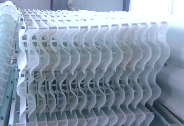 本產(chǎn)品葉片采用最新復(fù)合材料制作而成的,高強度、耐酸 、耐堿 、耐高濃度氯 離子、耐磨、表面光滑等優(yōu)點。并能在150℃煙氣溫度工況下連續(xù)使用,當(dāng)脫硫除塵系統(tǒng)出現(xiàn)故障,如雙堿 法或其他脫硫工藝管道出現(xiàn)結(jié)垢或是循環(huán)泵出現(xiàn)故障,使吸收塔內(nèi)的煙氣溫度急速升高,如采用pp(聚丙稀)除霧器就會出現(xiàn)整體或者局部坍塌,本產(chǎn)品最大能承受150℃煙氣溫度連續(xù)使用,即使脫硫系統(tǒng)出現(xiàn)故障煙氣溫度升高,本產(chǎn)品除霧器也能正常使用,不會影響整個脫硫系統(tǒng)正常運行。