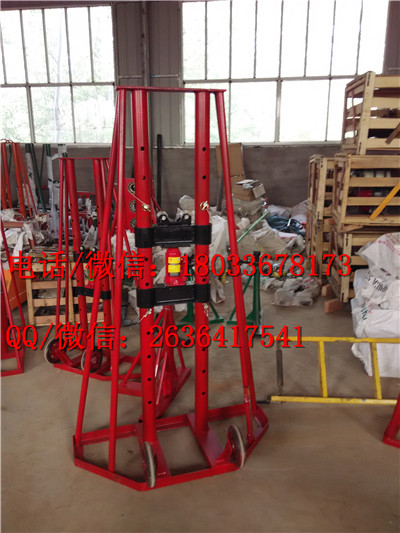 液壓放線架,屬輸電線路架設維修用放線架的設計與制造技術領域。在底座的加強筋上 有一主支架。在軸承固定板中心部帶有軸承。在墊塊的上面有一千斤頂。在主支架的兩側上帶有后支撐架。在行走輪固定板上帶有行走輪。本實用新型的使用是以兩 臺放線架為一組。使用時將導線盤推入兩臺放線架之間,由千斤頂調整軸承固定板的高度。然后將線盤軸穿入軸承芯孔,即可放線操作。由于本實用新型帶有軸承, 使得線盤軸轉動變得輕快,減輕了拉線人員的勞動強度。另外由于帶有行走輪,在遇有復雜地形時可以推動行走,無須多人將其抬起搬運。還有就是因為兩臺放線架 相對為直立面,無須加長線盤軸的長度。又減小了相應部件的重量。從多方面做到省時省力,從而提高了工作效率。解決了現有產品存在的問題。