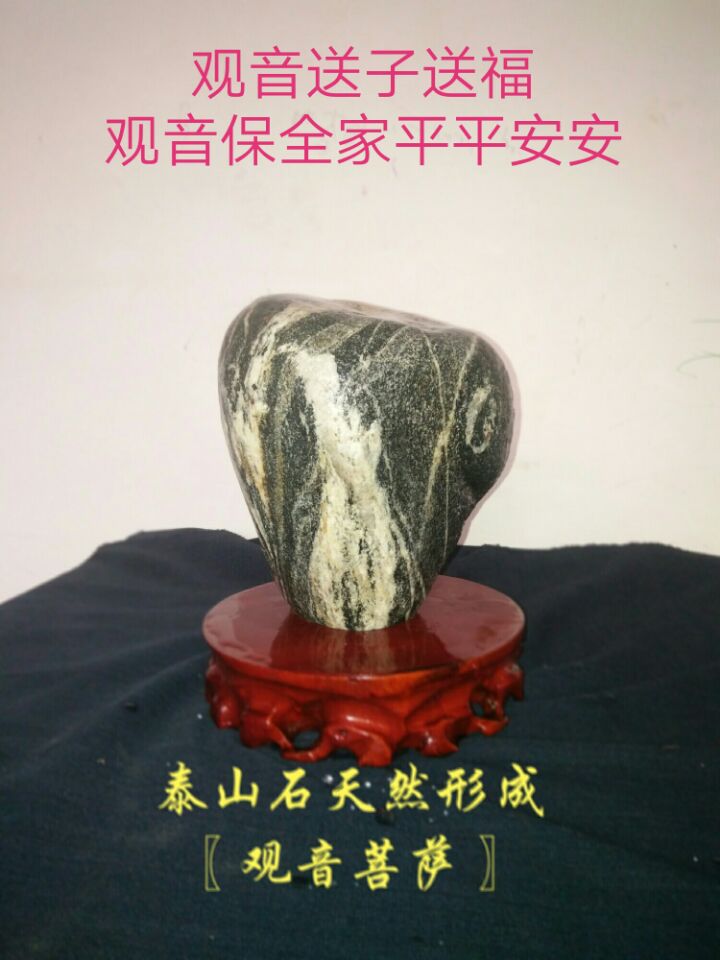 辨吉兇。泰山在東方,屬春,為青帝神的化身,是五岳之宗,降吉賜福之地!妒酚洝吩疲骸白怨攀苊弁蹶聡L不封禪”,“古者封泰山者七十二家”。秦、漢、唐、宋歷代皇帝封泰山求國泰民安 的聲勢均非常之大。老百姓登泰山朝圣求平安 者更是數不勝數。人們篤信泰山是神山,泰山石是神石。 泰山奇石頭(觀音菩薩)天然紋理高26寬15重18.8斤