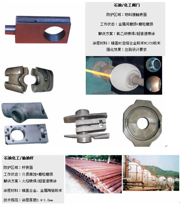 使用等離子/超音速噴涂對石油化工所使用的設(shè)備進(jìn)行耐磨防腐處理,可以有效的延長設(shè)備的使用壽命。 石油鉆采、煉化所使用的特種專業(yè)設(shè)備和特種石油開采工具,在特定的使用環(huán)境下,對投入運(yùn)轉(zhuǎn)設(shè)備及其部件的耐磨損、耐腐蝕、抗疲勞特性都提出了特定的要求。如:石油專用的高壓井口閥閥板、閥桿、閥座,各種規(guī)格的抽油泵柱塞、增注泵柱塞、鉆桿接箍、抽油桿接箍、抽油桿、光桿的耐磨損、耐腐蝕、抗疲勞要求以及石油煉化裝置的出關(guān)內(nèi)外壁,海上作業(yè)平臺、石油液化、汽化大口徑管道,抽油機(jī)機(jī)身、圍欄、護(hù)欄、防盜井口房、采油樹、計量站管道設(shè)施等噴涂鋅、鋁、不銹鋼材料進(jìn)行長效防腐可替代傳統(tǒng)的油漆、環(huán)氧樹脂防腐,其有效防腐壽命為30-60年之久。