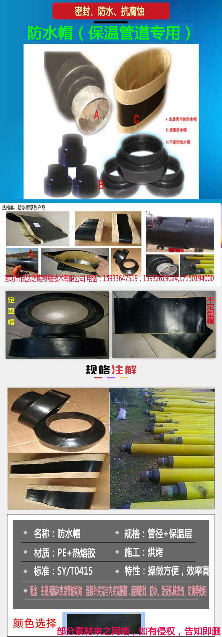 熱縮防水帽主要用于具有泡沫夾克管的兩端,連接外夾克與內夾克鋼管,起到密封、防水、免受機械損傷,防腐等做用。