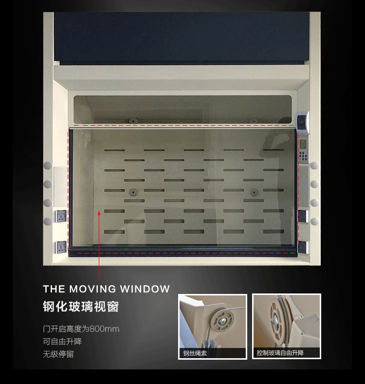 7、視窗:采用5mm厚安 全防爆玻璃配平衡組合,平衡部分為無端式結構設計,玻璃操作門設計了左、右推拉,上、下開啟,靈活的操作程序,可安 全的完成特殊的實驗。