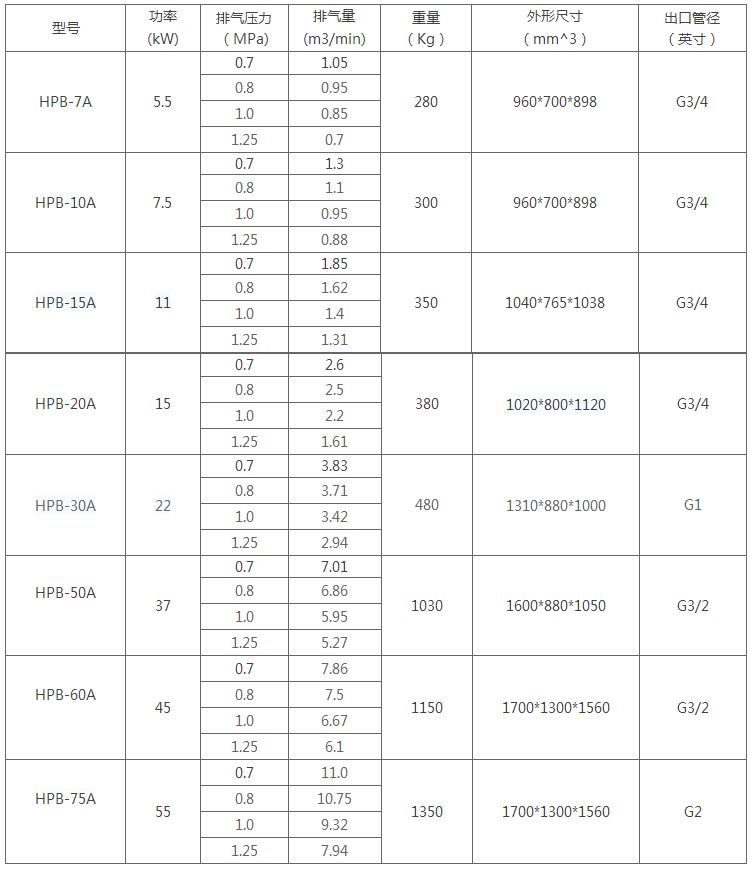 hpb系列空壓機技術參數