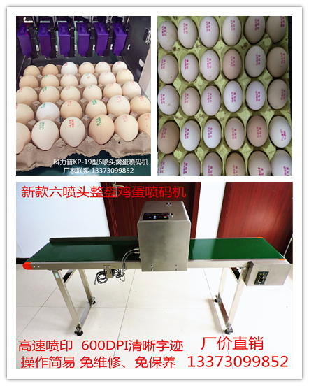這是一款為蛋殼上噴碼的高清晰度,高速度,多功能,免維護(hù)的一款六噴頭蛋品噴碼機,可以直接放蛋托上同時打印。
