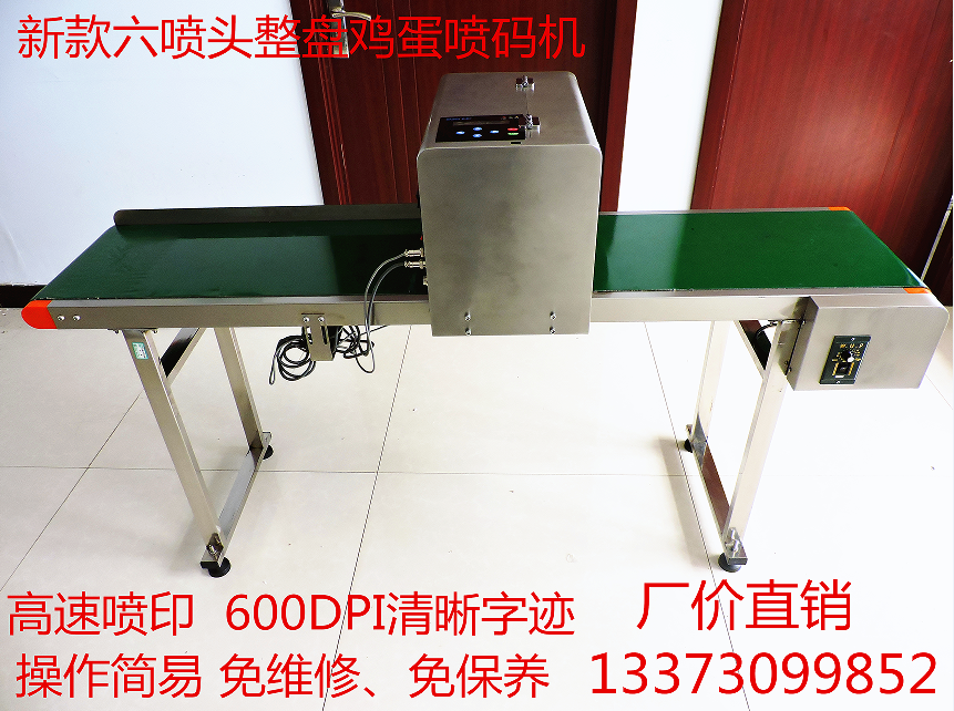 這是一款為蛋殼上噴碼的高清晰度,高速度,多功能,免維護的一款六噴頭蛋品噴碼機,可以直接放蛋托上同時打印。