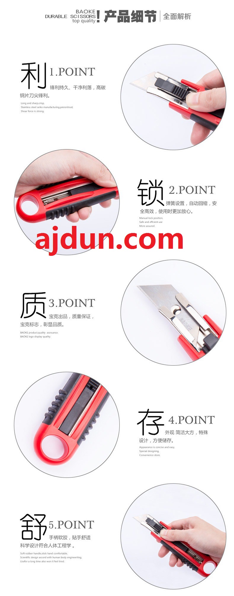 1.艾捷盾安 全刀ajd-21816手柄采用工程塑料abs材料制造,手柄上漏有防滑防震pu,合用時手感舒適,不容易疲勞,ajd-21816設(shè)計符合人體工程學(xué)設(shè)計,防滑且握感舒適便利