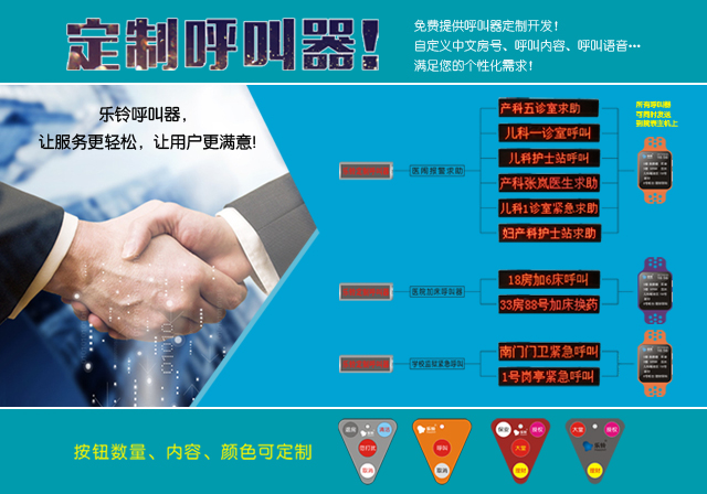 樂鈴無線呼叫器,讓服務更輕松,讓用戶更滿意。hb883移動腕表主機,雙語操作系統,支持任何語言定制,可以免費定制中文房號,包房名稱,呼叫服務內容等。支持方案開發定制。自動組網,技術先進,無需設置。樂鈴無線呼叫器,機型眾多,功能完善,有一體機,分體機,led顯示屏主機,數碼管顯示屏主機,各類型腕表呼叫器,支持小批量定制,大量出貨,時間周期短,品質好。支持oem,odm等,中文主機支持中文房號顯示+語音報號+配電腦呼叫管理軟件+手機客戶端,提供api數據輸出,上位機對接等功能,支持大型工廠項目,工程項目定制化需求,我們有專業的技術研發隊伍提供技術對接,開發支持。