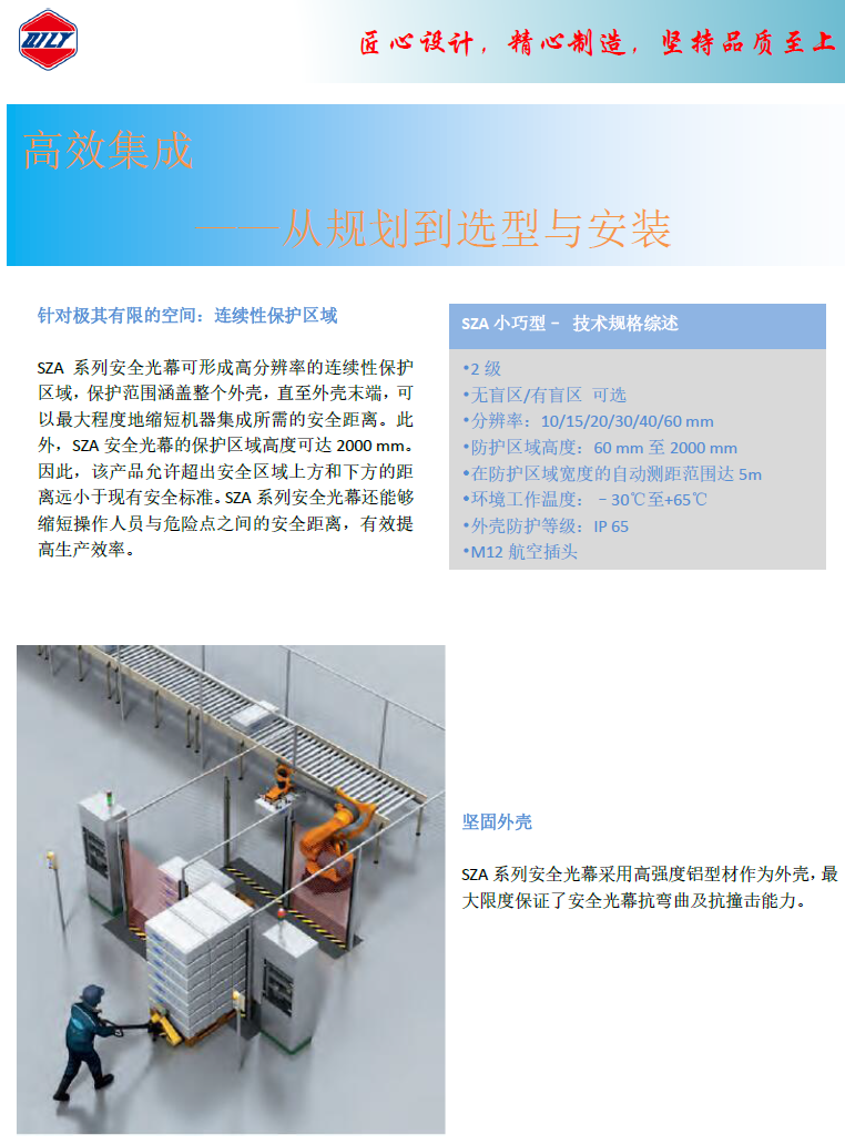 sza系列安 全光幕可形成高分辨率的連續性保護區域,保護范圍涵蓋整個外殼,直至外殼末端,可以最大程度地縮短機器集成所需的安 全距離。此外,sza系列安 全光幕的保護區域高度可達2000 mm。因此,該產品允許超出安 全區域上方和下方的距離遠小于現有安 全標準。sza系列安 全光幕還能夠縮短操作人員與危險點之間的安 全距離,有效提高生產效率。