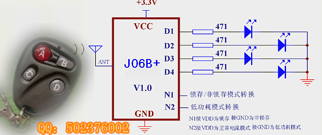 4002遙控器可以和同頻率的學(xué)習(xí)碼接收模塊j05b或者和高靈敏度學(xué)習(xí)碼接收模塊j06b+配套使用,遙控器abcd 4個(gè)按鍵對(duì)應(yīng)j06b的d1-d4輸出端口,j06b具有2種輸出模式,用戶可選擇鎖存或非鎖存輸出。
