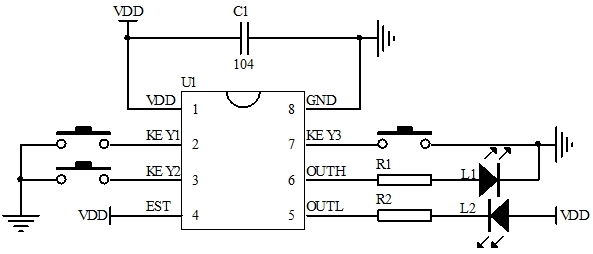 三路按鍵輸入控制兩路電平信號同步輸出(二選一),上電不工作outl為高電平,outh為低電平。