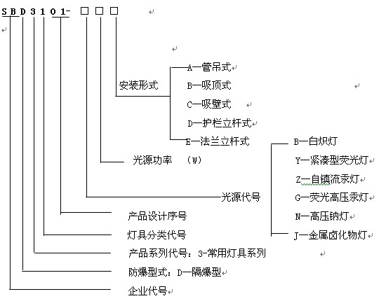 選型舉例:例如sbd3101-n150a表示隔爆型常用防爆燈具系列,光源為150w高壓鈉燈,管吊式安 裝。