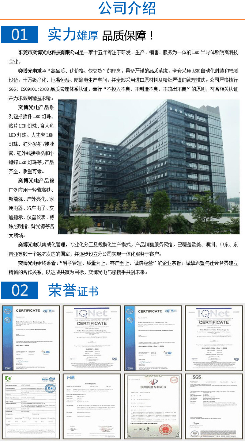 奕博光電秉承“高品質、優價格、快交貨”的理念,具備嚴謹的品質系統,全套采用ASM自動化封裝和檢測設備,十萬級凈化、恒溫恒濕、防靜電生產車間,并全部采用進口原材料及精細嚴謹的管理模式。公司嚴格執行SGS、ISO9001:2008 品質管理體系認證,奉行“不投入不良、不制造不良、不流出不良”的原則...