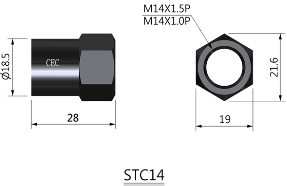 說 明:牙規 m 14 * pitch 1.5 (1.0),緩沖行程 25 mm。產品以pe袋封口包裝,再裝入內盒,附兩個螺帽;定位螺帽為選購配件。
