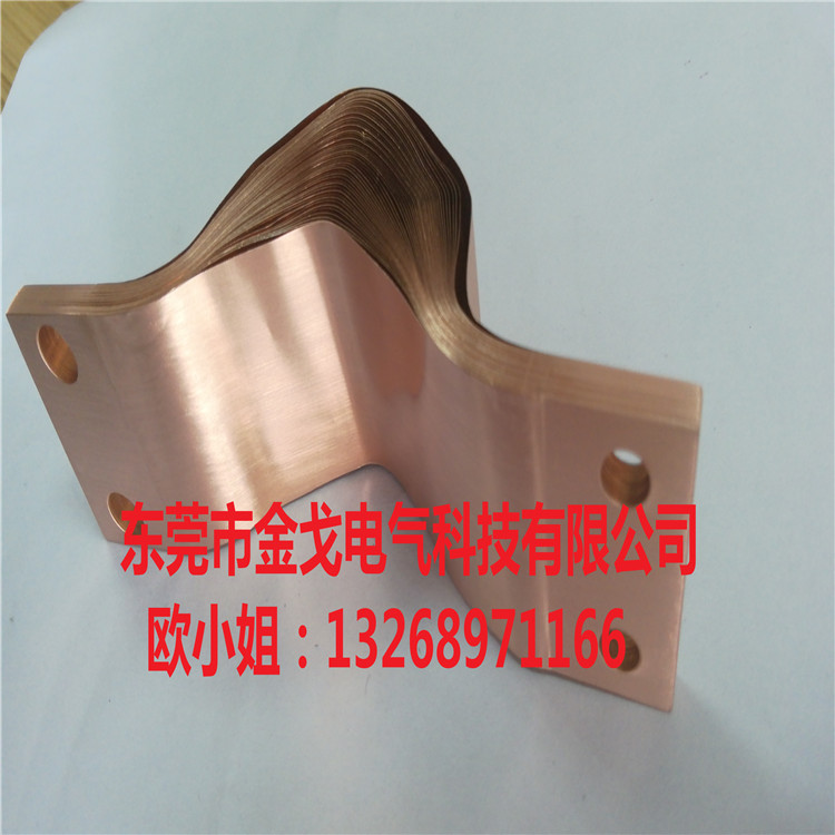銅箔軟連接定義:銅箔軟連接是一種大電流導體(安 裝接觸面采用焊壓設計生產),東莞金戈電氣采用壓焊或對焊技術,一次性焊接成型,產品導電率高、承受電流大、電阻值小、抗疲勞耐用、易散熱等特點,產品廣泛用于各種發電機組、開關、母線、電解、冶煉等大電流電氣設備中做柔性導電連接