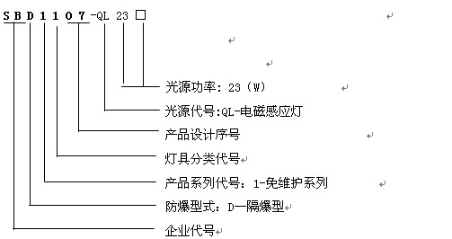 選型舉例:例如 sbd1107-ql23d表示隔爆型免維護系列防爆吸頂燈具,電磁感應燈光源,功率23w,吸頂式安 裝。