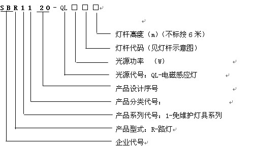 選型舉例:例如sbd1120-ql120r02表示免維護(hù)防爆馬路燈系列,電磁感應(yīng)燈光源,功率120w,雙頭路燈桿,高度6米,每一支路燈桿配兩只燈具。