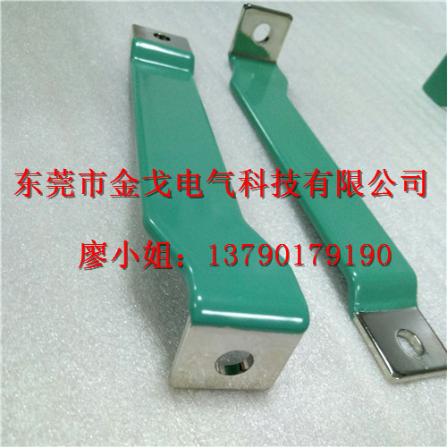 噴涂母排是將絕緣樹脂粉 未通過特殊工藝處理包附在銅排上,以實現四周絕緣的母排。由于涂層的散熱性良好,涂層的位置、厚度、大小不受限制,噴涂母排比傳統的熱縮管方案大大提高了導流量,也解決了各種異形銅排的絕緣問題。