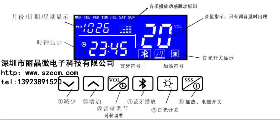 時鐘調節:長按③鍵3秒則關閉藍牙播放功能可以調整日期和時間,此時時鐘顯示小時的數字閃爍,在閃爍時可通過按下①鍵或②鍵調整小時值;調整完畢后再按③鍵,時鐘顯示分鐘的數字閃爍,在閃爍時可通過按下①鍵或②鍵調整分鐘值;再按下③鍵,顯示月份數字閃爍,在閃爍時通過按下①鍵或②鍵調整月份,以此類推,后于年份設置完畢后待數字不再閃爍即完成時鐘設置;(時鐘設置只能在藍牙功能關閉的情況下才能操作)