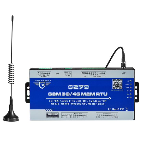 gsmgprs3g4grtu遠程控制終端s275提供6路高精度的4~20ma、0~20ma、0~5vdc工業標準模擬量變送器輸入或pt100熱電阻輸入、8路數字量輸入、4路繼電器輸出以及1路溫濕度輸入,1路rs485支持modbusmaster、modbusslave以及透明傳輸,當作為modbusmaster時,支持320個映射寄存器,可直接讀取智能儀表、i/o模塊、plc的數據進行比較判斷和報警。通過無線的gsm、gprs、3g、4g無線網絡,用戶無需親臨現場,可以根據不同的需要進行功能的配置,當觸發后,本產品會立即通過短信、撥打電話、gprs、3g、4g網絡通知用戶以及傳輸數據到監控中心、手機app、web監控中心,同時自動執行關閉或開啟某些設備的動作。