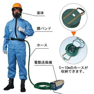 構成:電動送風式長管呼吸器由面罩、腰帶、長管和電動送風機四部分構成。電源電壓 ac100v50hz(配有ac220v轉ac100v變壓器)