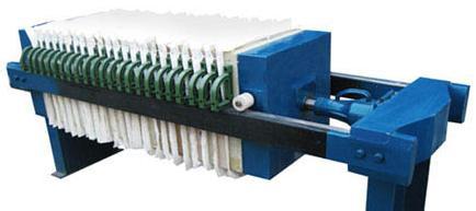 板框壓濾機有手動壓緊、機械壓緊和液壓壓緊二種形式。手動壓緊是螺旋千斤頂推動壓緊板壓緊;機械壓緊是電動機配h型減速箱,經機架傳動部件推動壓緊板壓緊;液壓壓緊是有液壓站經機架上的液壓缸部件推動壓緊板壓緊。兩橫梁把止推板和壓緊裝置連在一起構成機架,鑄鐵壓濾機機架上壓緊板與壓緊裝置餃接,在止推板和壓緊板之間依次交替排列著濾板和濾框,濾板和濾框之間夾著過濾介質;壓緊裝置推動壓緊板,將所有濾板和濾框壓緊在機架中,達到額定壓緊力后,即可進行過濾。懸浮液從止推板上的進料孔進入各濾室(濾框與相鄰濾板構成濾室),固體顆粒被過濾介質截留在濾室內,濾液則透過介質,由出液孔排出機外。