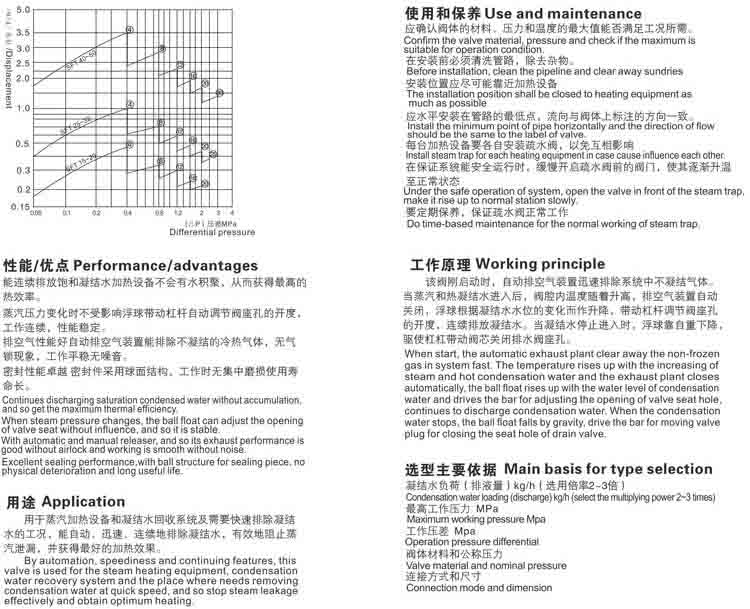 浮球式疏水閥利用雙閥孔,使閥蕊在開閥時壓力相對減少,從而獲得大排量。工作時浮球隨閥腔內液體位的變化而上下浮動,帶動杠桿打開或關閉閥座。由于閥座孔在凝結水水位以下,形成水封,水、汽自然分離,達到無蒸汽泄漏。背壓率為80%,小工作壓力0.01mpa,從0.01mpa至使用壓力范圍之內不受溫度和工作壓力波動的影響,連續排水。能排飽和溫度凝結水,小過冷度為0℃,加熱設備里不存水,能使加熱設備達到換熱效率。