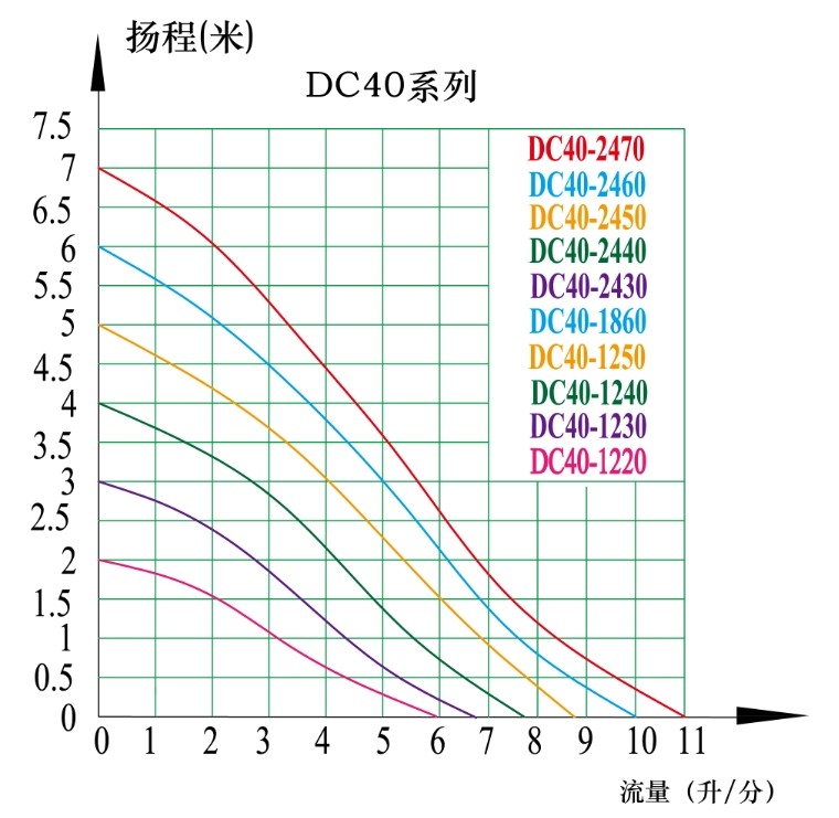 | 選型注意事項(xiàng) | 如果選用調(diào)速型號(hào)則在后面加上字母a,例如dc40-2470a。 選型時(shí)務(wù)必給出使用環(huán)境:如連續(xù)工作時(shí)間、水溫、介質(zhì)等,水泵功率超過(guò)24w就不適合長(zhǎng)期在60度以上水溫連續(xù)工作,請(qǐng)務(wù)必與專(zhuān)業(yè)人員溝通以便選擇最合適的水泵型號(hào)! 上述電流為水泵的開(kāi)口電流即當(dāng)水泵直接放入水中不接任何系統(tǒng)時(shí)的電流,也為水泵最大電流,當(dāng)水泵接上系統(tǒng)之后水泵的工作電流會(huì)降低到最大負(fù)載電流的70%-85%。 水泵的揚(yáng)程為最大送水高度,即到達(dá)最大揚(yáng)程點(diǎn)的流量為零。 水泵的流量為水平流量,即水平抽水的流量。 | ||||