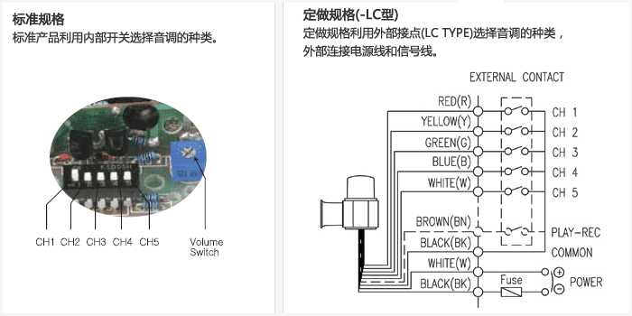 產(chǎn)品內(nèi)部配裝有音調(diào)選擇開關(guān)及音量調(diào)節(jié)器,使用者可以根據(jù)需求相應(yīng)的調(diào)節(jié)音調(diào)和音量大小